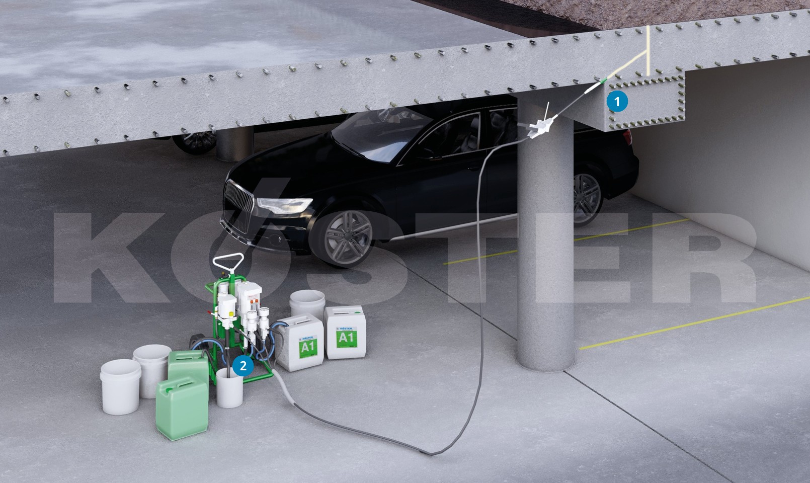 By injecting the joint with the elastic acrylic gel KÖSTER Injection Gel S4/B+, it is not necessary to excavate underground parking garages or other underground building components. Moreover, since a low number of packers is sufficient in most cases, the drilling effort is reduced and time and costs are saved.